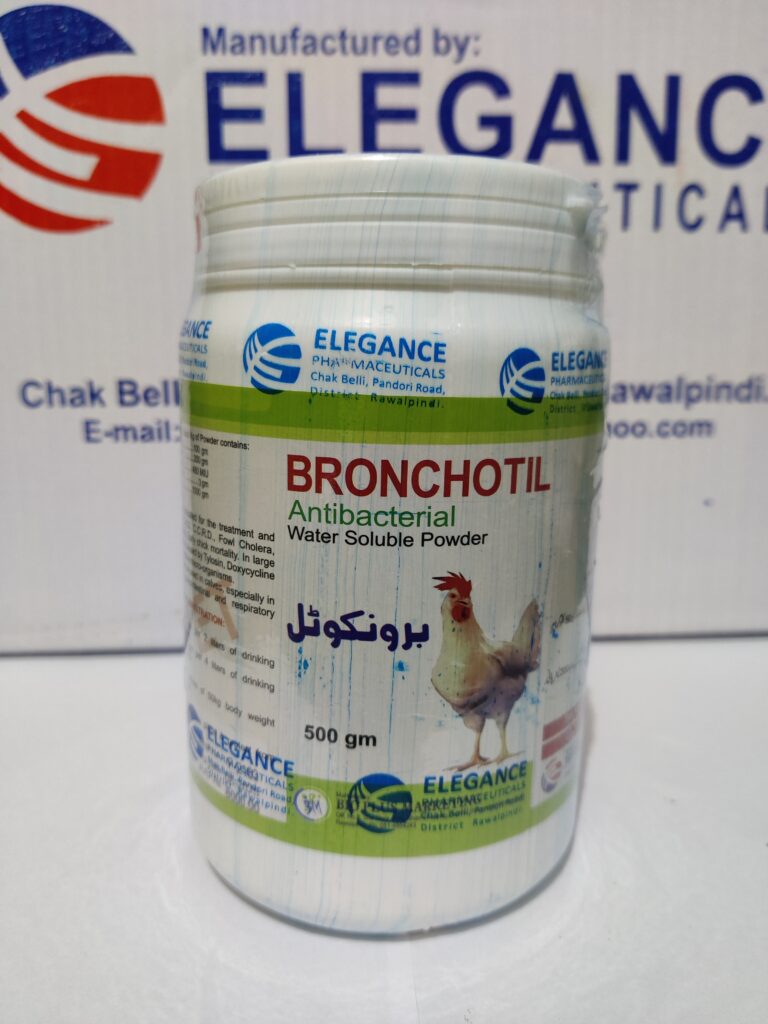 Bronchotil is indicated for the treatment and prevention of C.R.D, C.C.R.D, Fowl Cholera, Bacterial Enteritis, Early chick mortality. In large animals infection caused by Tylosin, Doxycycline and Colistin sensitive micro-organisms.